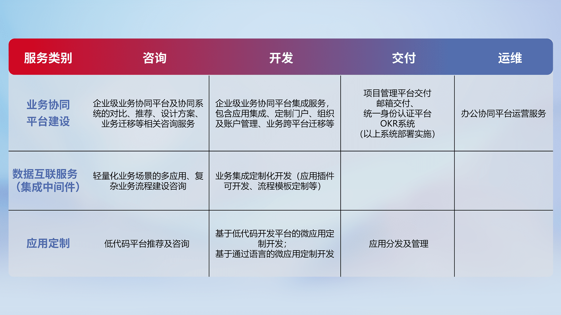 针对钉钉、、、、企微、、、、IDaas等平台级产品提供产品的规划、、方案、、、、交付、、、、定制化开发等服务,,,,实现如统一协同办公、、、智能客户服务、、、混合会议管理、、、、智能数据查询、、、、等业务场景,,实现数字化转型。。。