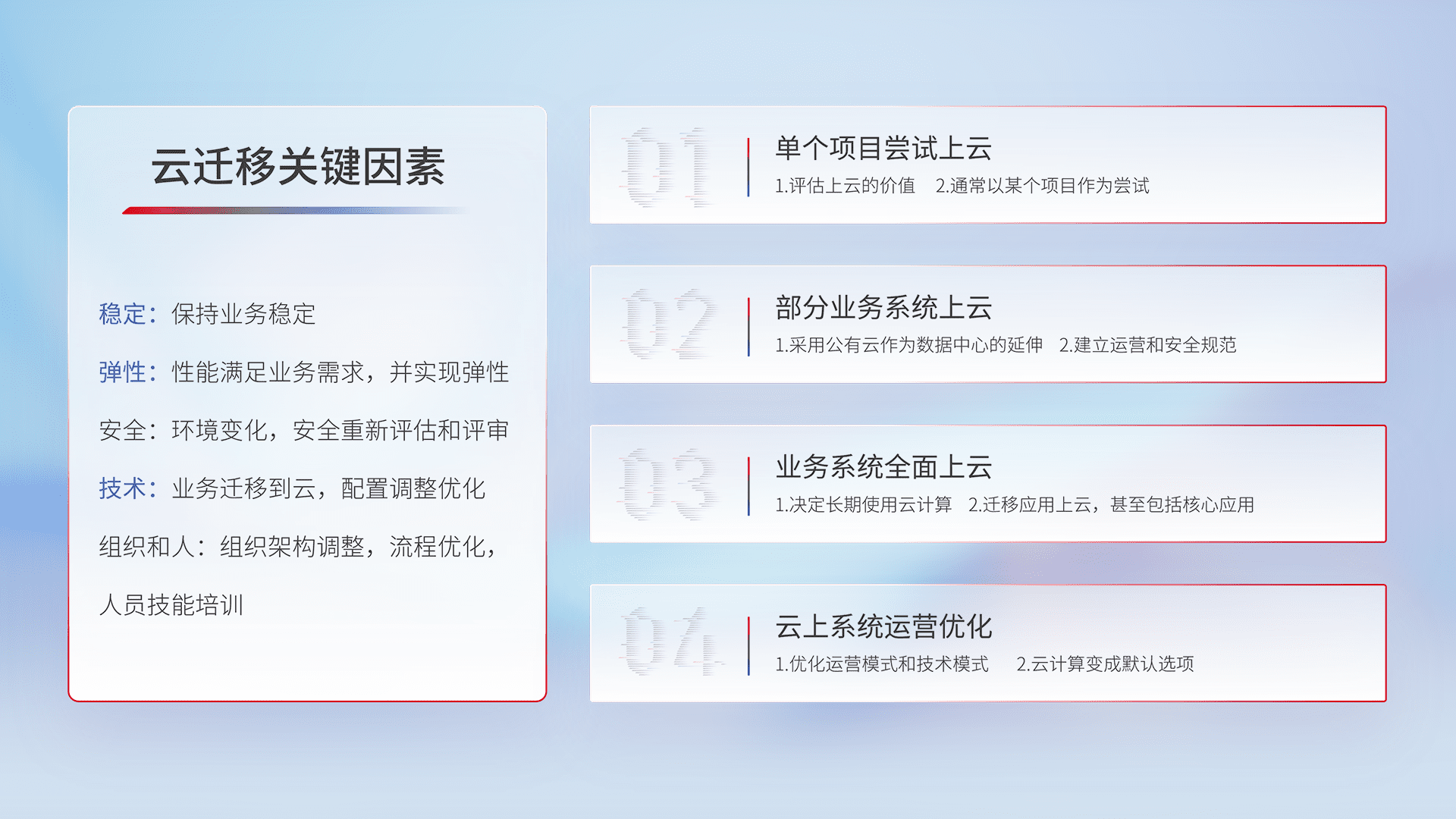 结合实际业务,,,,从规划设计、、、云平台选型、、云原生改造、、数据迁移、、、、集成交付,,,迁移全过程为客户识别最佳上云路径,,,做好风险识别管理,,设计网络架构、、身份权限、、安全审计合规、、操作审计、、、、日志审计、、监控告警策略、、、、多站点容灾设计等,,对云上基础设施进行整体规划,,,,提升IT治理水平,,,,以满足弹性、、高可用、、高性能的需求。。。。