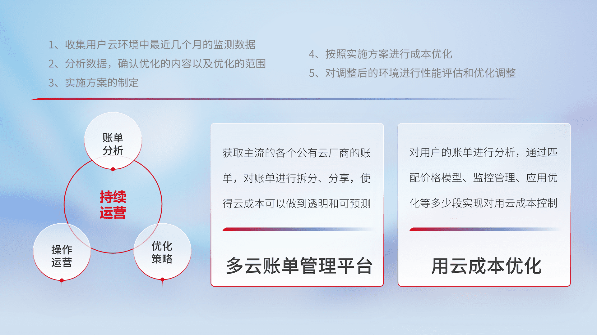 通过多云纳管,,以统一的资源数据模型把客户的云资源进行抽象和封装,,,进而实现对多云资源的统一操作,,保障云资源管理的可靠性、、、、稳定性与可用性。。量身定制化运维内容,,,,配置、、、开发运维、、、、补丁管理、、、备份、、、、监控、、认证和访问管理、、、审计和日常巡检等,,,保障在用云过程中的可靠度,,,,稳定度以及高可用率。。。。